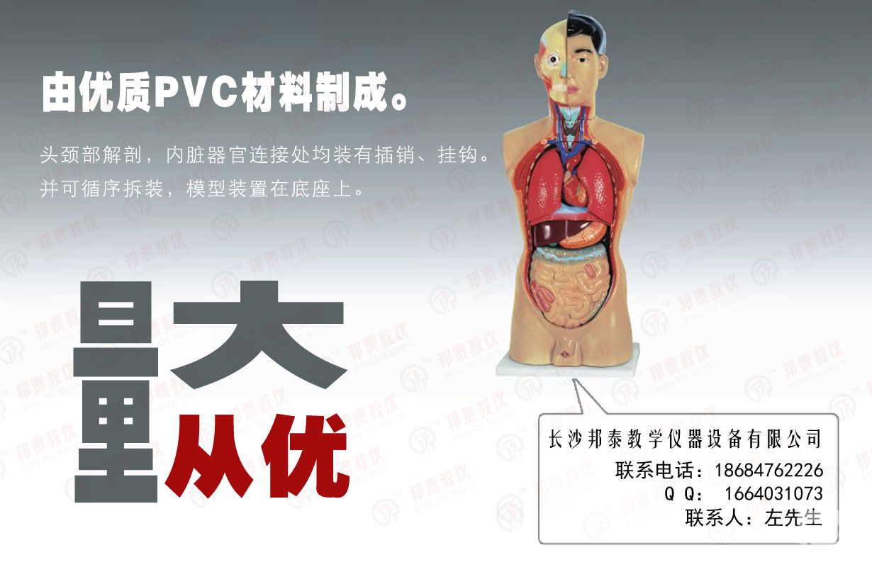 由優質PVC材料制成。頭頸部解剖,內臟器官連接處均裝有插銷、掛鉤。并可循序拆裝,模型裝置在底座上。