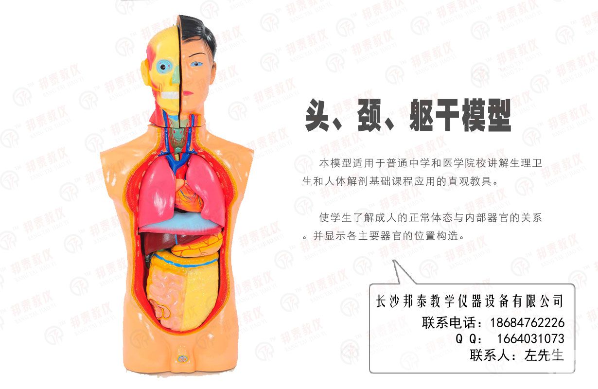 本模型主要顯示人體內部器官的位置及頭部解剖的形態和構造。并突出表現呼吸、消化、泌尿等三個系統。