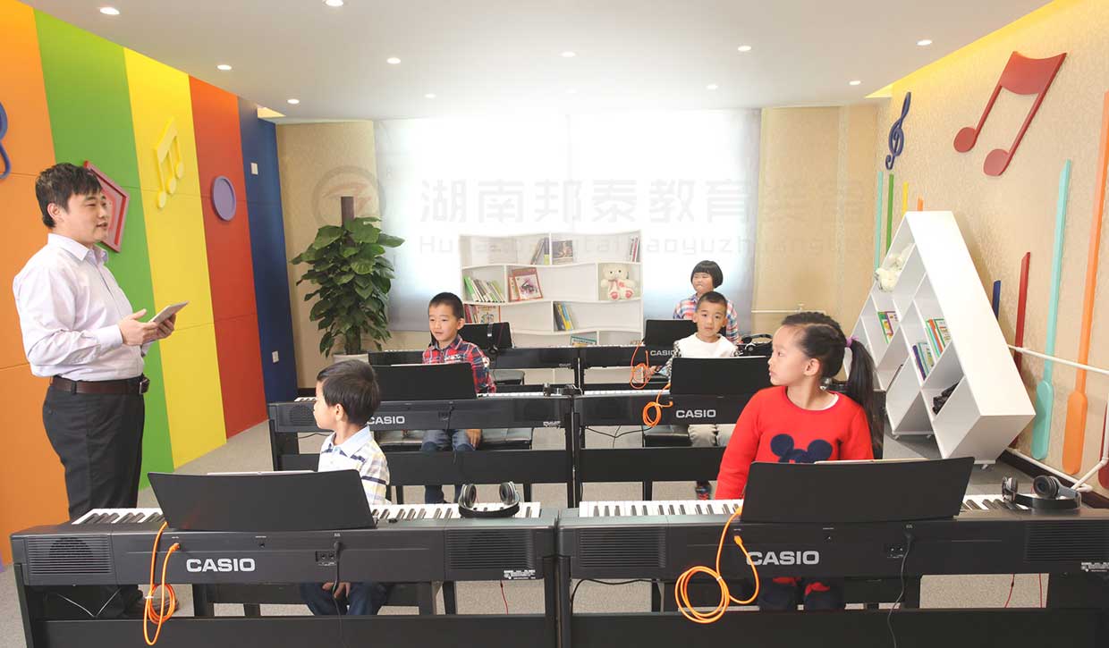 湖南邦泰教育裝備有限公司的音樂教室首先要配備有一套音樂欣賞與表達(dá)設(shè)備,音響、調(diào)音臺、功放、話筒、五線譜電教板、等多媒體相關(guān)設(shè)備必不可少,與此同時,硬件的配置少不了軟件資源的支撐,所以要配備音樂歌曲資源和多媒體教學(xué)軟件(軟件視小、初、高不同階段,配置不同軟件)。
