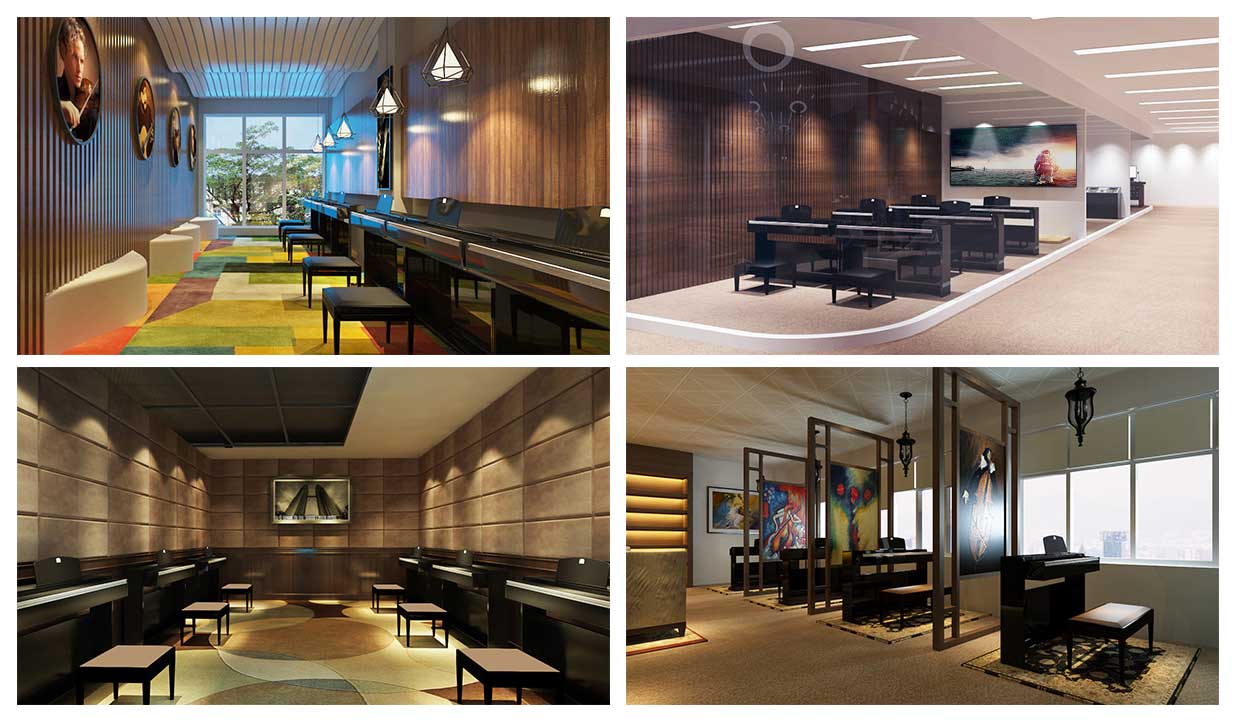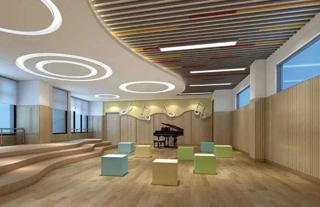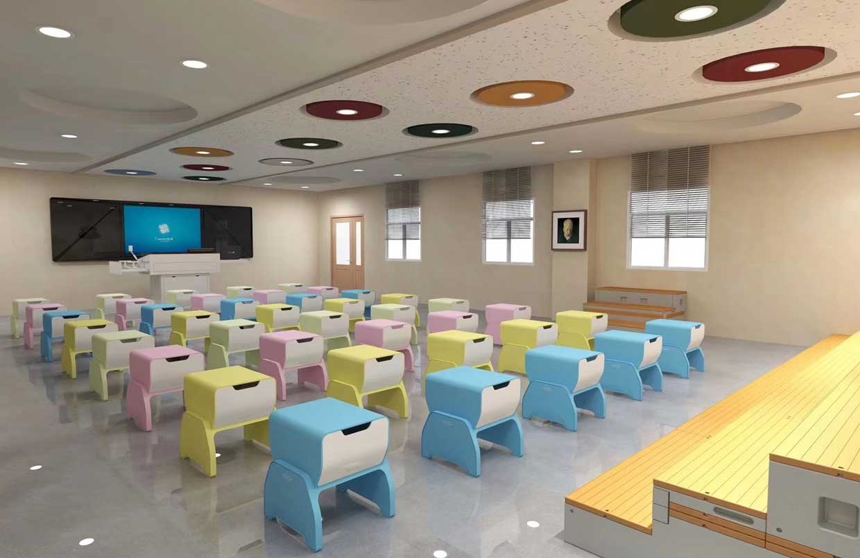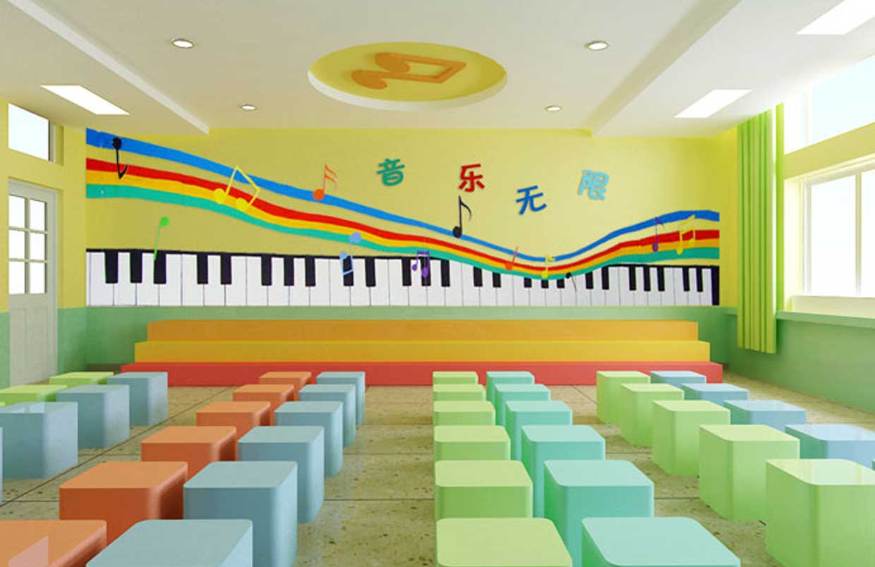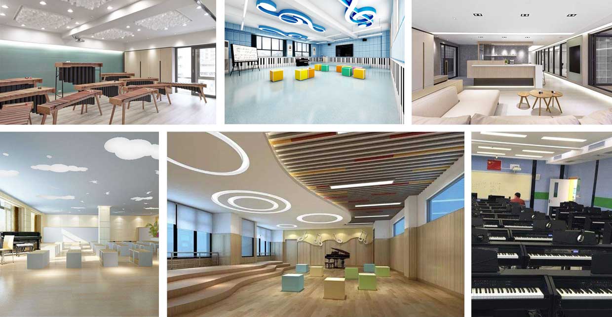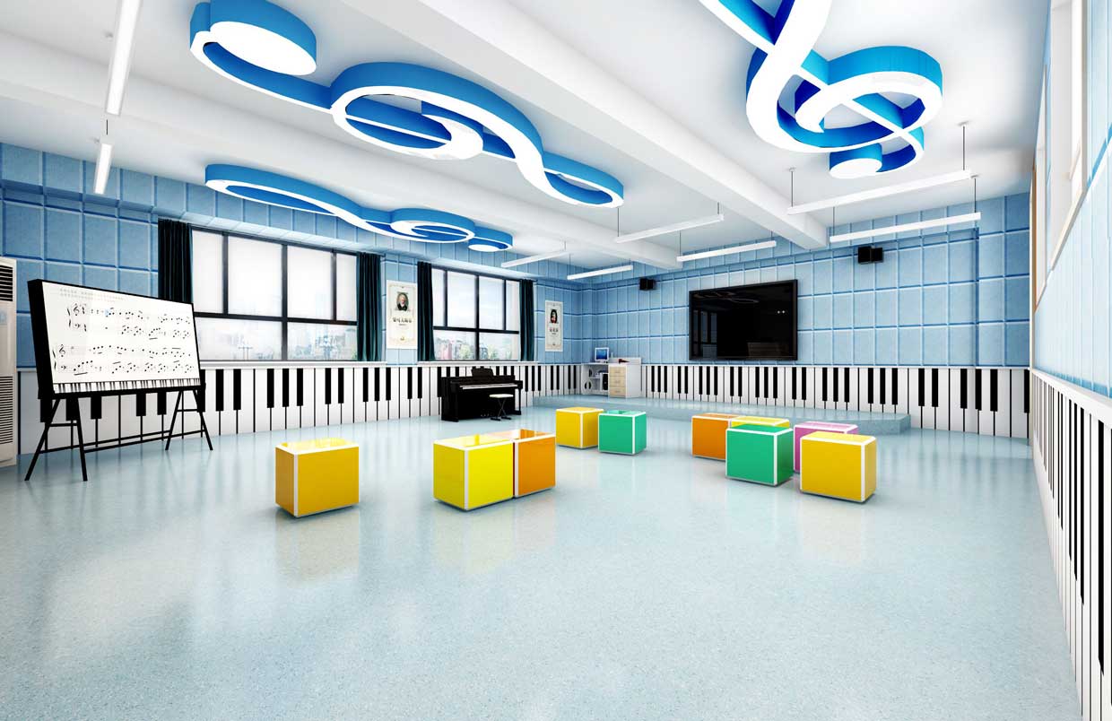 對于教師的教學(xué)需要配備有譜架、教師桌椅等,而學(xué)生應(yīng)有六面體凳和普通帶小桌板的椅子等。教室四周墻壁可懸掛音樂家掛圖、樂器掛圖、識譜知識掛圖、音樂故事簡介等,可以幫助學(xué)生了解關(guān)于音樂的相關(guān)知識。此外還可以用各種各樣彩色的音符點綴教室,色彩偏亮色,活躍而灑脫。可取教室一邊一塊區(qū)域可以設(shè)置儲物柜,用于儲藏各種樂器。