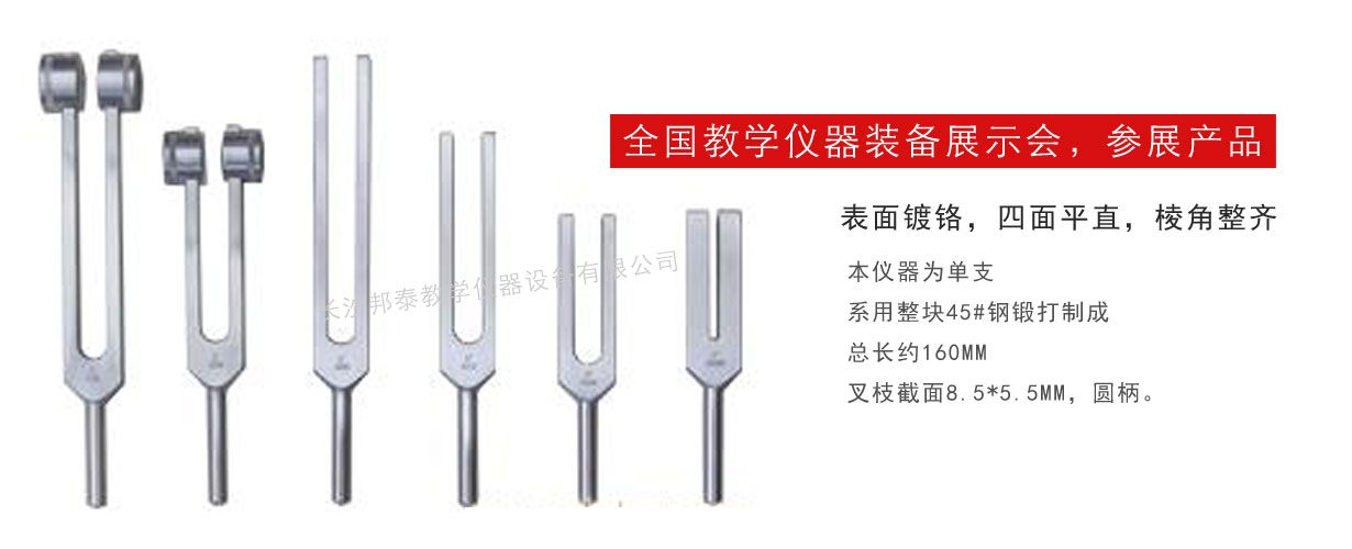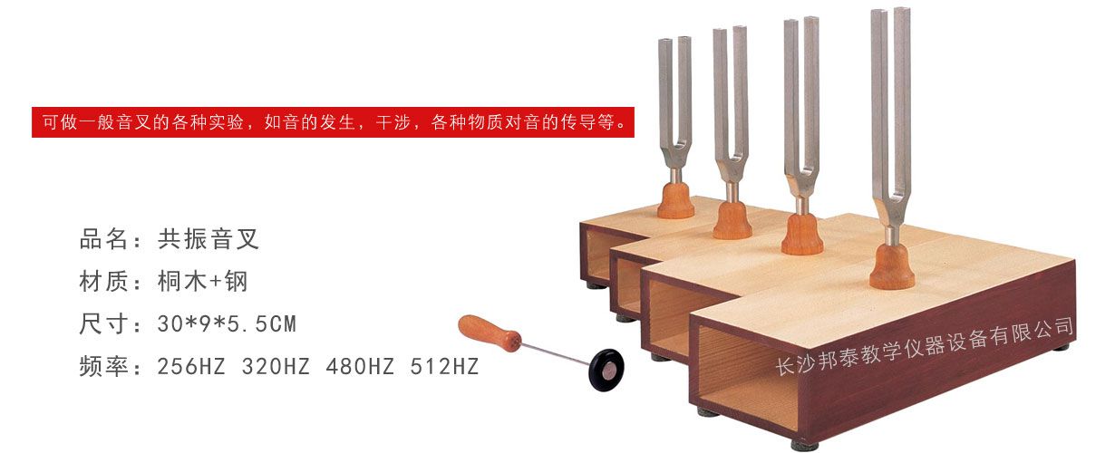 共振音叉供中等學校演示聲音的共鳴。干涉和“拍”,在聲速的測定和聲音在固體。液體的傳播等實驗中,可用音叉做聲源,也可做一般音叉的各種實驗,如音的發生,干涉,各種物質對音的傳導等。